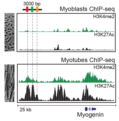 Gene expression is regulated by functional elements in the genome such as enhancer elements. Tissue-specific gene expression through regulated use of specific enhancer sequences is a major mechanism of development in an organism. Genomics provides powerful tools to study the DNA sequences involved in these processes. We use unbiased proteomics approaches to study proteins and assembled protein machinery at regulatory genomics elements, using a well studied in vitro model of C2C12 muscle differentiation.