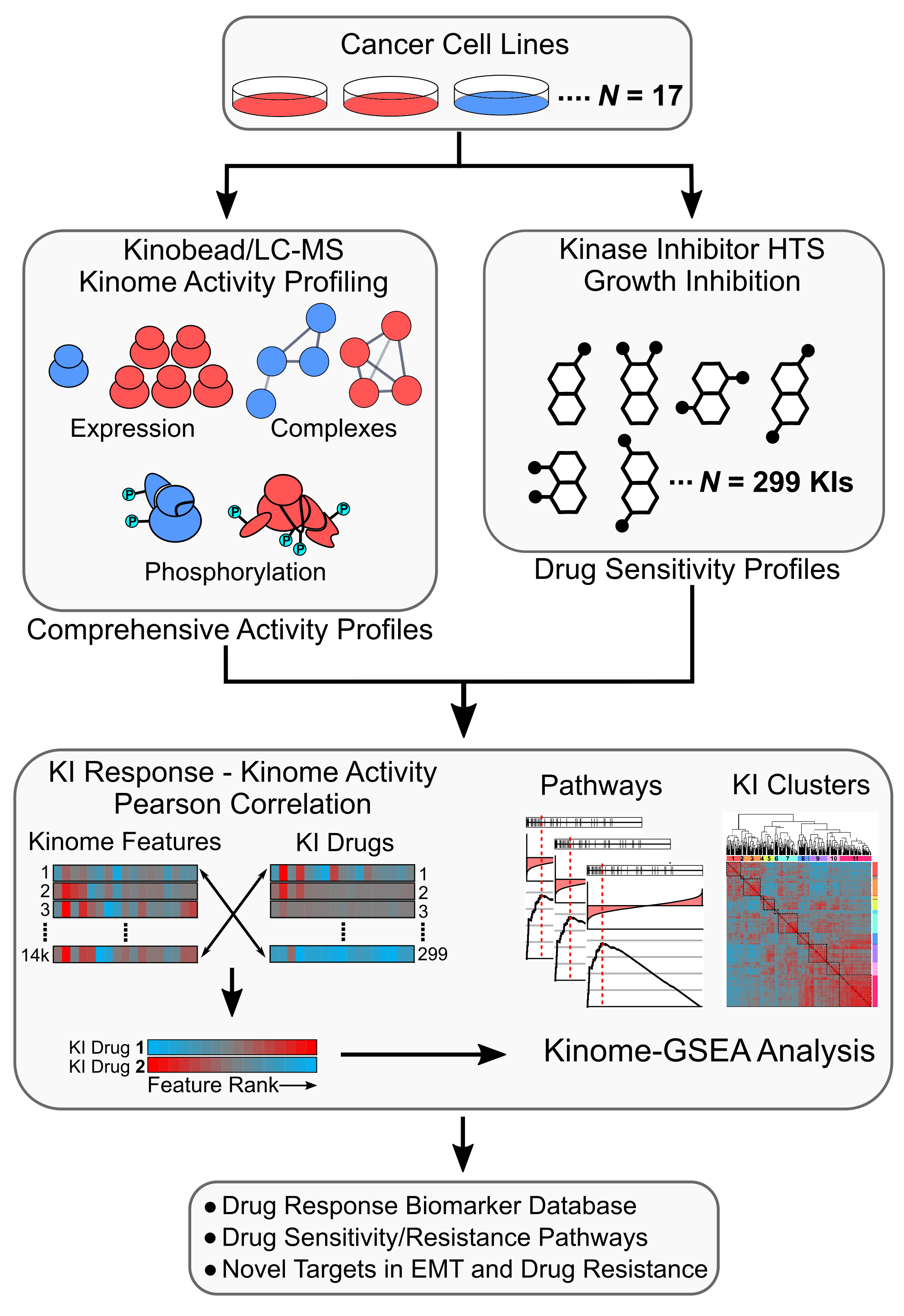 We developed a new pharmacoproteomics platform combining kinome activity profiling with a kinase inhibitor screen to identify pathway biomarkers of drug response in cancer cell lines.